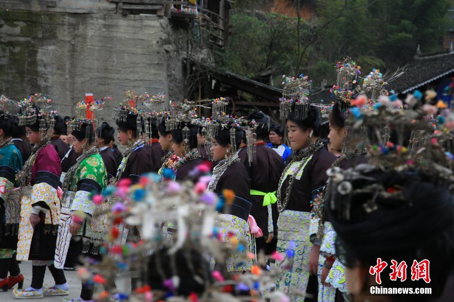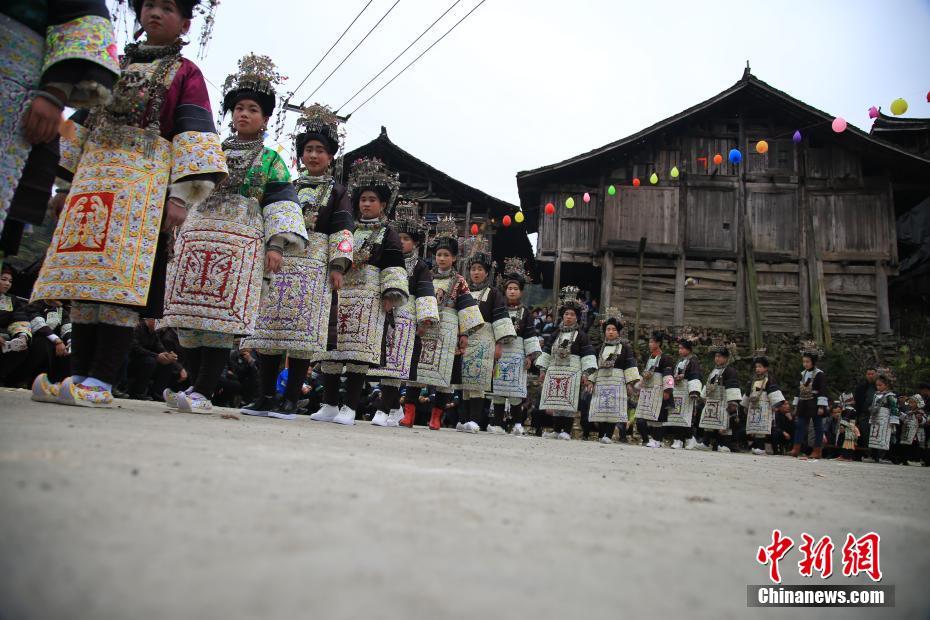 2月6日,贵州省榕江县仁里乡仁吉侗寨,姑娘们穿着盛装跳芦笙舞,庆祝新春佳节。当日,贵州省榕江县乐里镇乔勒侗寨和仁吉村田坝寨、大寨来到仁吉村富寨开展“吃相思”活动。“吃相思”是侗族地区节日期间或农闲时节,村与村、寨与寨之间相互走访的一种民俗活动。当地侗族青年在吃相思活动上,跳芦笙舞,秀盛装,寻找意中人。杨文舒摄