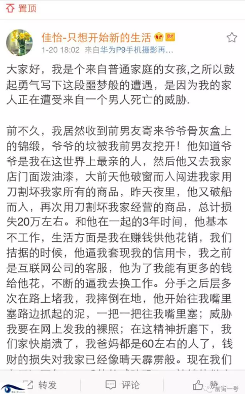 1月20日,寝食难安的王慧在微博中表示,其前男友章某某(1991年生,浙江杭州富阳人)与其相恋3年,交往之后王慧受不了章某某好吃懒做等恶习,便与其分手。分手后,章某某对其实施殴打,并威胁要发布其裸照,甚至到她父母开设的商铺门店中泼红漆和打砸;章某某还挖了王慧爷爷的坟并破坏墓碑,将包裹骨灰盒的锦缎寄到了王慧工作单位,最后她迫于压力离职。