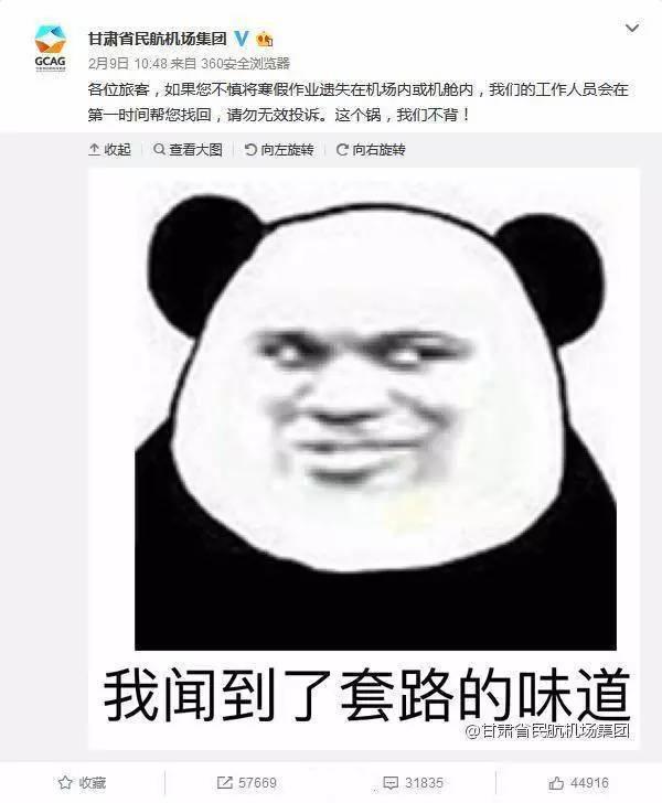 事情的起因是这样的,2月9号甘肃省民航机场集团发微博称:“各位旅客,如果您不慎将寒假作业遗失在机场内或机舱内,我们会在第一时间帮您找回,请勿无效投诉。这个锅,我们不背!”