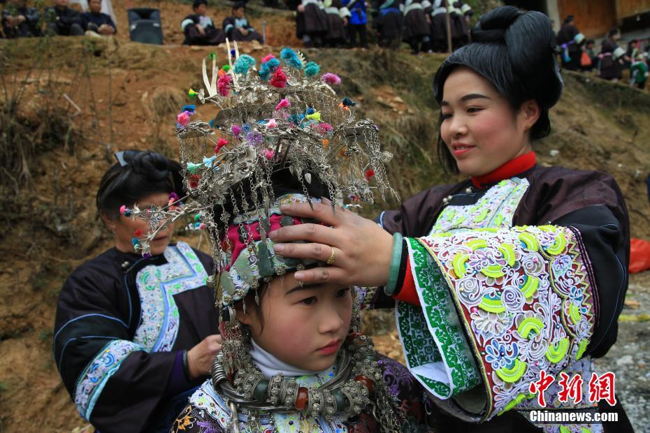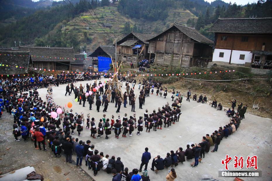 2月6日,贵州省榕江县仁里乡仁吉侗寨,姑娘们穿着盛装跳芦笙舞,庆祝新春佳节。当日,贵州省榕江县乐里镇乔勒侗寨和仁吉村田坝寨、大寨来到仁吉村富寨开展“吃相思”活动。“吃相思”是侗族地区节日期间或农闲时节,村与村、寨与寨之间相互走访的一种民俗活动。当地侗族青年在吃相思活动上,跳芦笙舞,秀盛装,寻找意中人。杨文舒摄