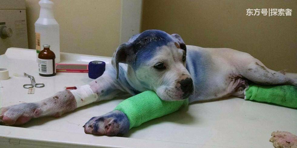 在美国加州的一所宠物医院内,一只4个月大的流浪狗萎靡不振的躺在医院的病床上,这只流浪狗遭到虐待,全身被人喷满了油漆,并被车子拖行之后导致腿部严重受伤,流浪狗身体十分虚弱,看到人都感到十分的害怕。