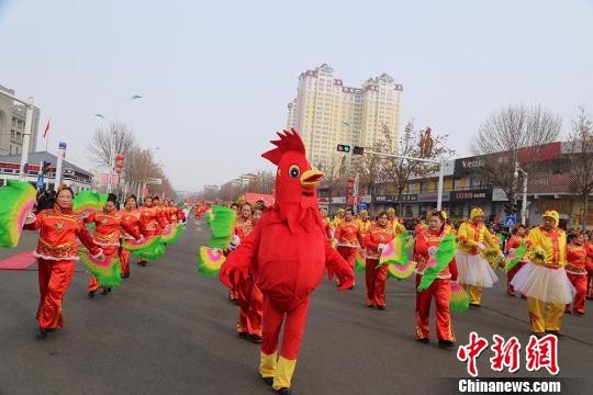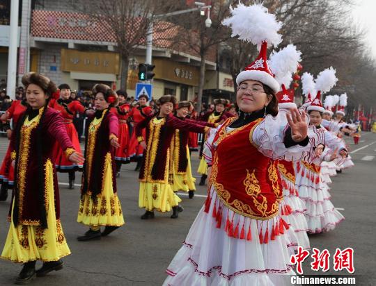 中新网新疆塔城2月11日电(记者闫文陆)新疆北部的塔城市11日举办元宵节社火巡游活动。作为新疆最知名的社火活动之一,塔城市的巡游不仅包括了秧歌、花车、舞狮、舞龙等传统社火活动,亦融入哈萨克、维吾尔等歌舞,展现多民族相融共生的包容文化。